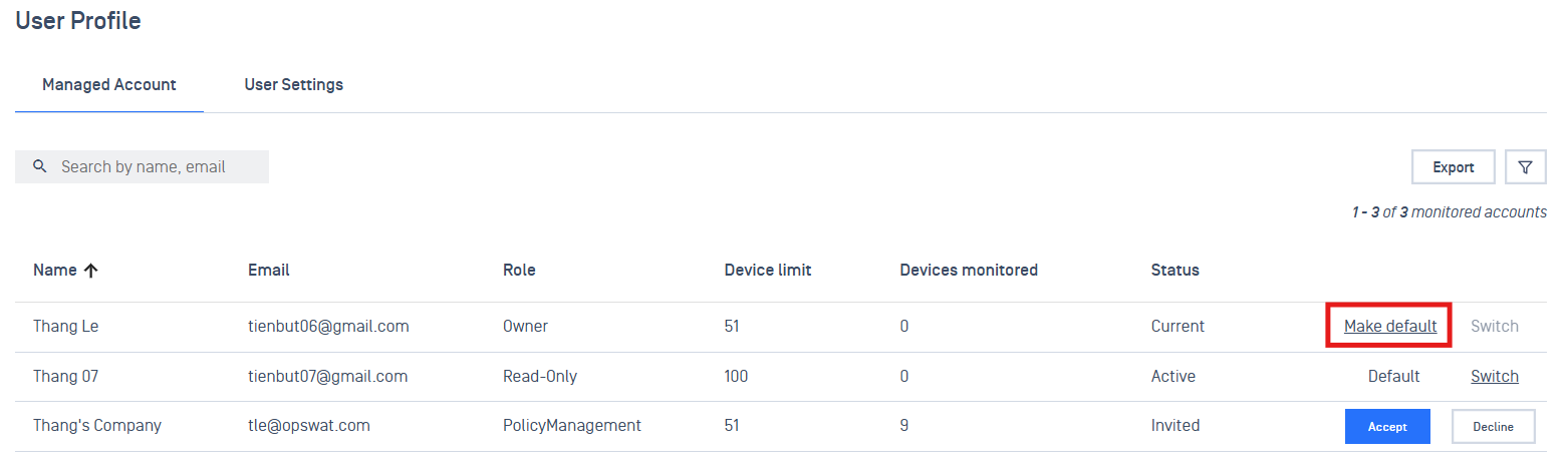 My OPSWAT Central Management offers you the option to set one of your managed accounts as the default.