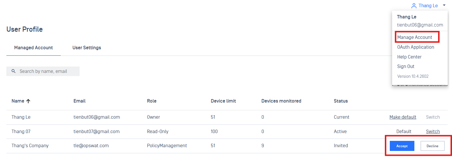 To manage endpoint products and view reports of other accounts, an owner or administrator of that account must send you an invitation. If you do not not have an OPSWAT Account, sign up a free account here.