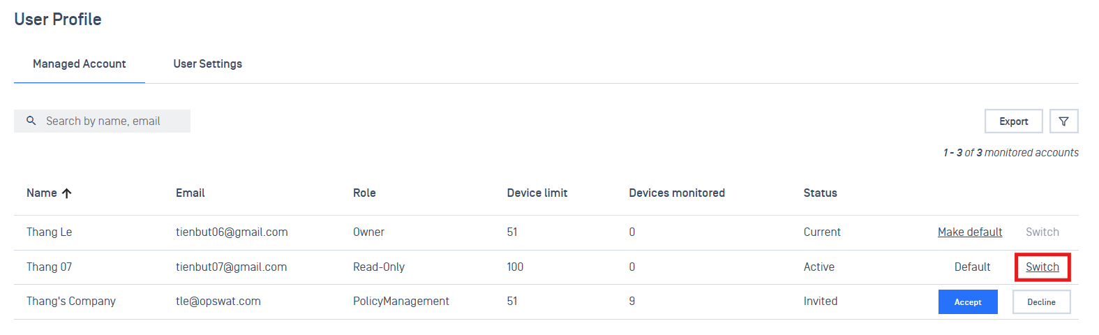 - Once you have accepted the Invitation, you will be free to switch to the other account in order to view account information and/or, if you have been granted administrator privileges, to configure policies and manage devices via that account.