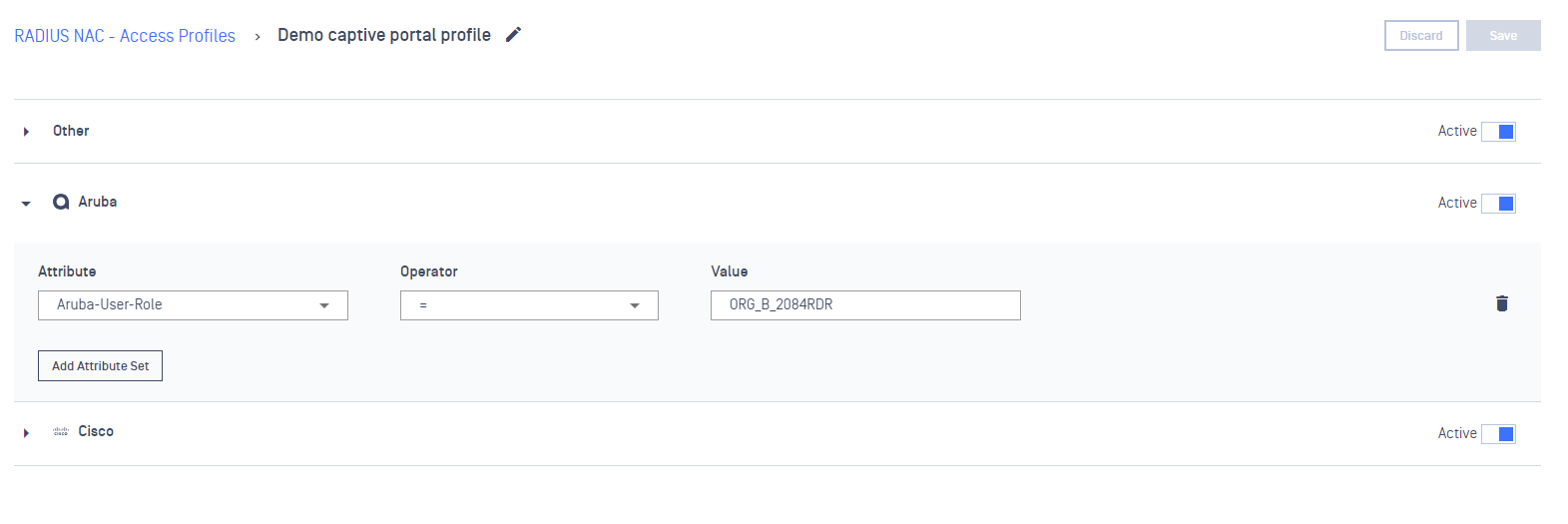 - On Aruba drop-down, declare a values (ex: ORG_B_2084RDR) for Aruba-User-Role attributes