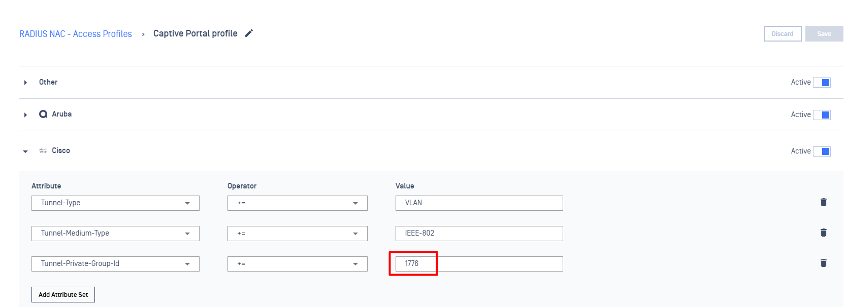 - On Cisco dropdown, declare a value (ex: 1776) for Tunnel-Private-Group-Id attribute