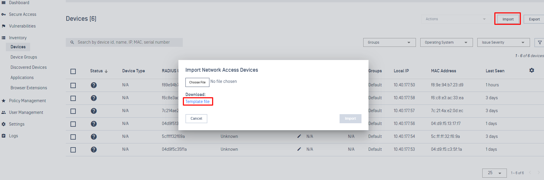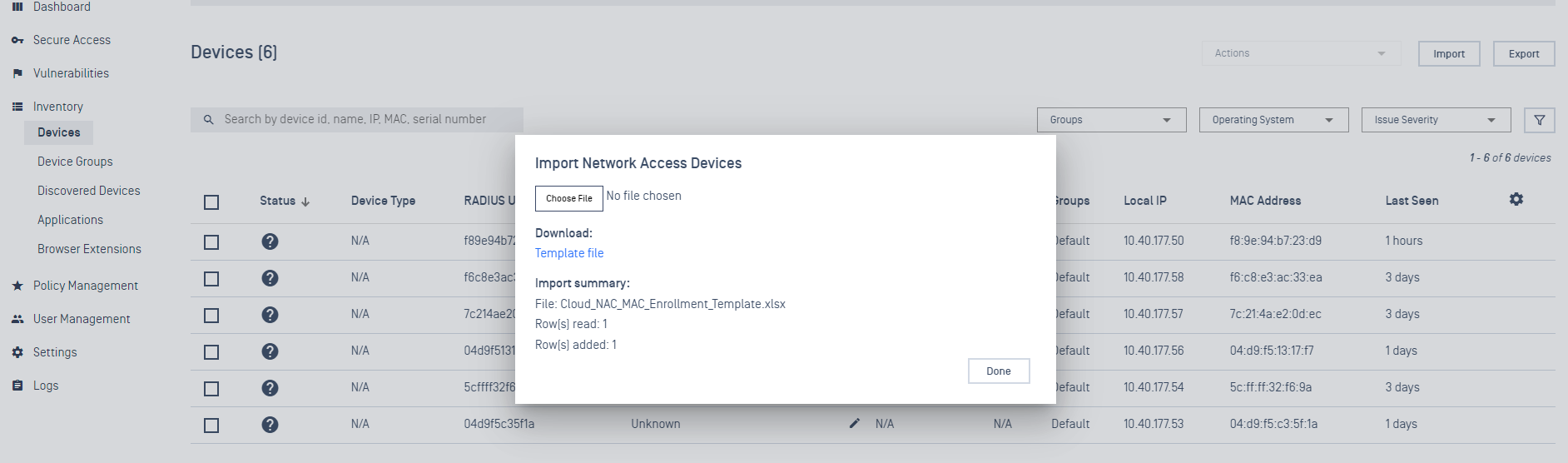The Device Enrollment feature allows administrators to easily import devices into the system. Each device will be automatically assigned to the appropriate Access Profile based on the provided information. Using a straightforward import mechanism, administrators can upload an Excel file with device details, including MAC addresses, device types, and operating systems.