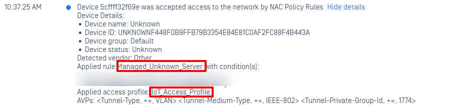 The above Rule will assign a IoT_Unknow_Server`` access profile to Device(s) that match with all of conditions defined.