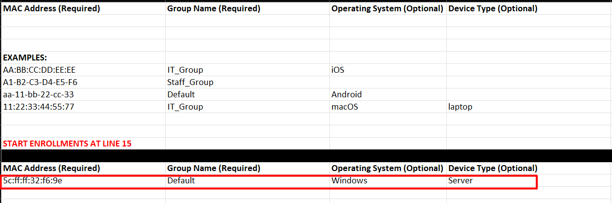 - Open the template spreadsheet that was downloaded and add a Device MAC Address and Device Group Name. Other available optional fields are Operating System, Device Type.