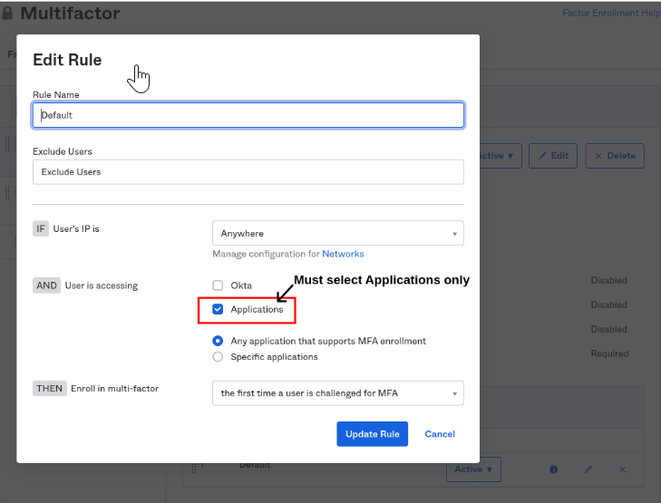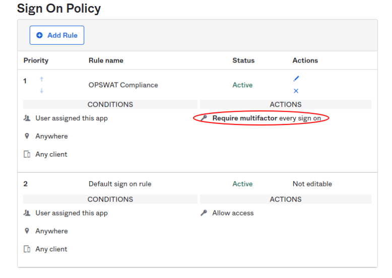 - In the newly created Mutlifactor Policy, click the pencil icon on the Default rule.