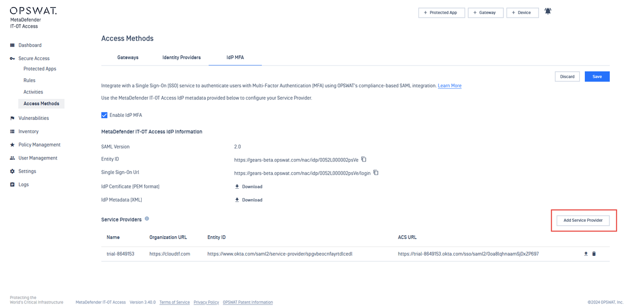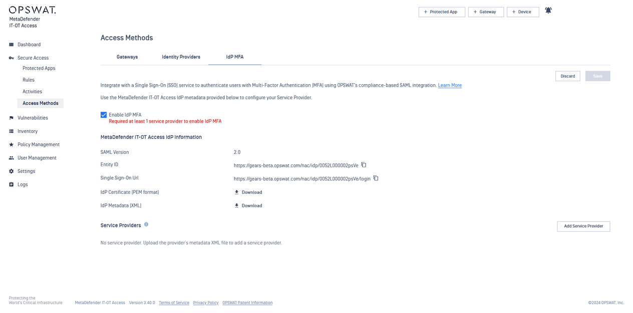 - In My OPSWAT Central Management, navigate to Secure Access > Access Methods > IdP MFA, and Enable IdP MFA