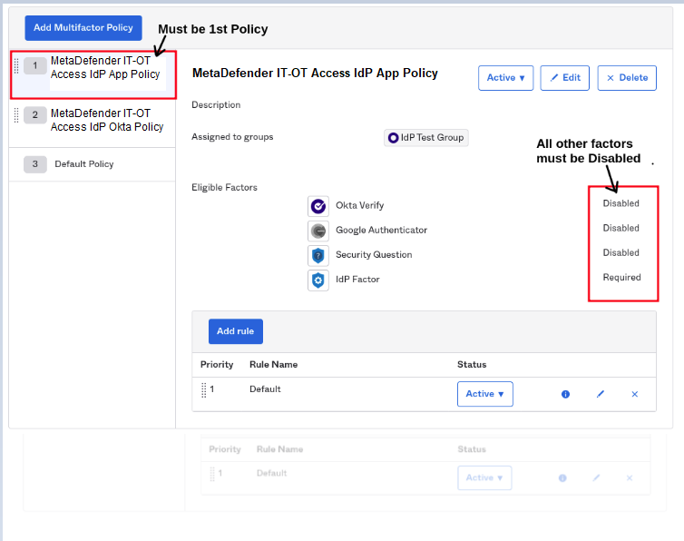 - Create a Multifactor Policy with only the IdP Factor Required and all other factors Disabled