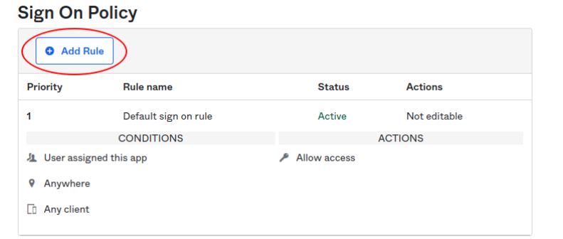 - Scroll down to Sign On Policy and Add Rule