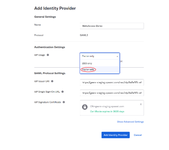 - Upload the Okta Metadata in My OPSWAT Central Management and Save