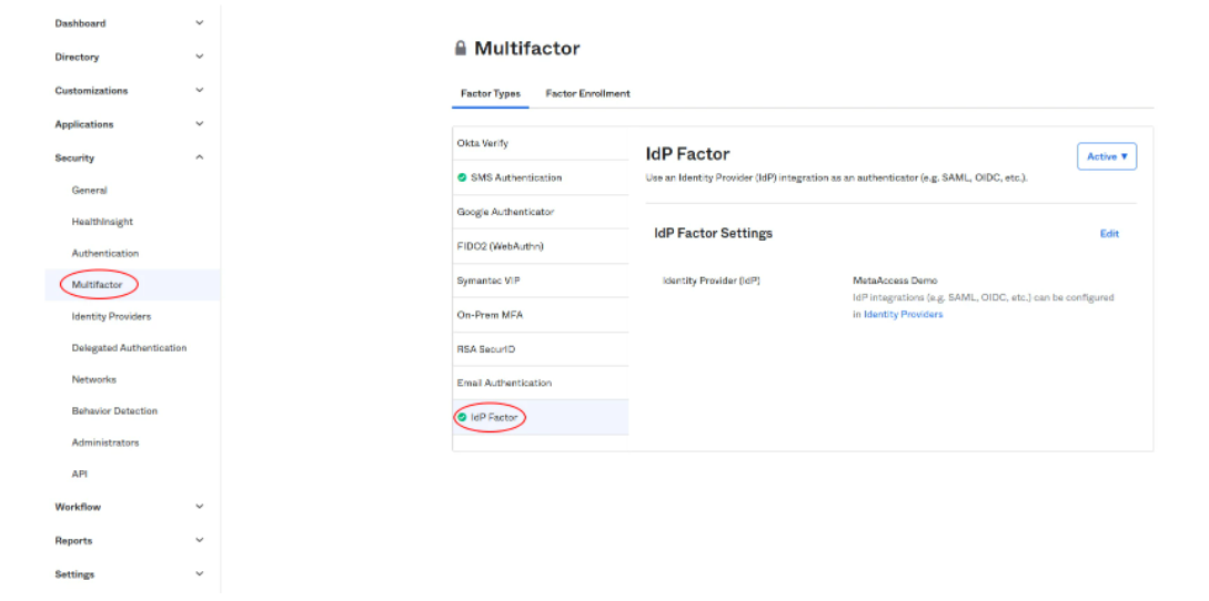- In Okta, navigate to Multifactor and configure IdP Factor to use the newly setup IdP