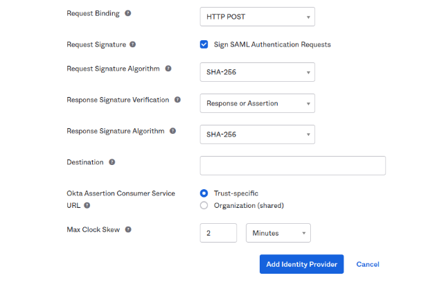 - Keep the default configurations in the Advanced Settings, then click “Add Identity Provider“