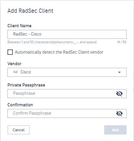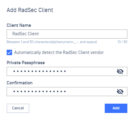 - Enter a Passphrase used to encrypt the private key associated with the client certificate that will be generated for this RadSec client