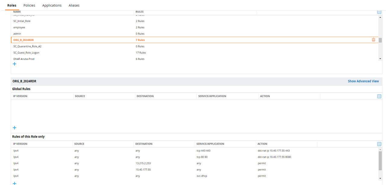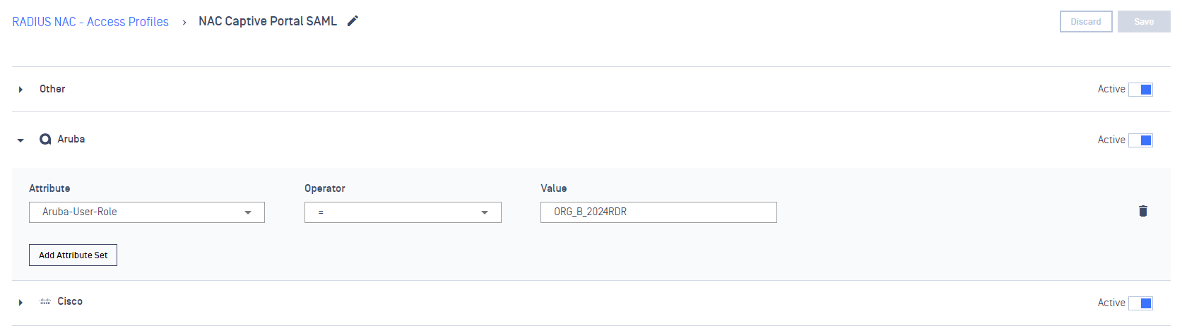 2. On Aruba dropdown, declare a value (ex: ORG_B_2024RDR) for Aruba-User-Role attributes