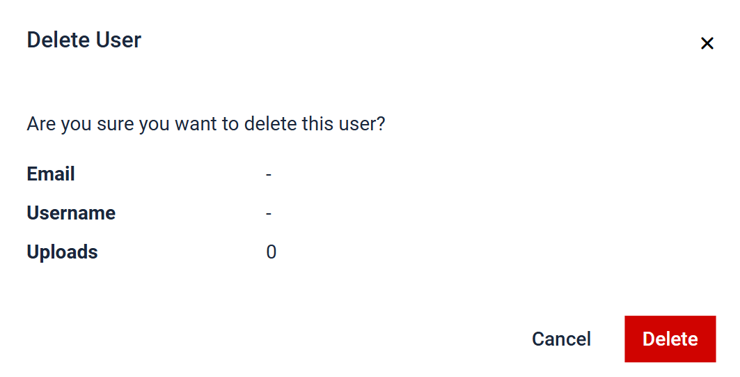 The pop-up window allows you to confirm the user that you wish to remove from the platform. After that you need to click "Delete", if you want to delete the user. If not, hit "Cancel"