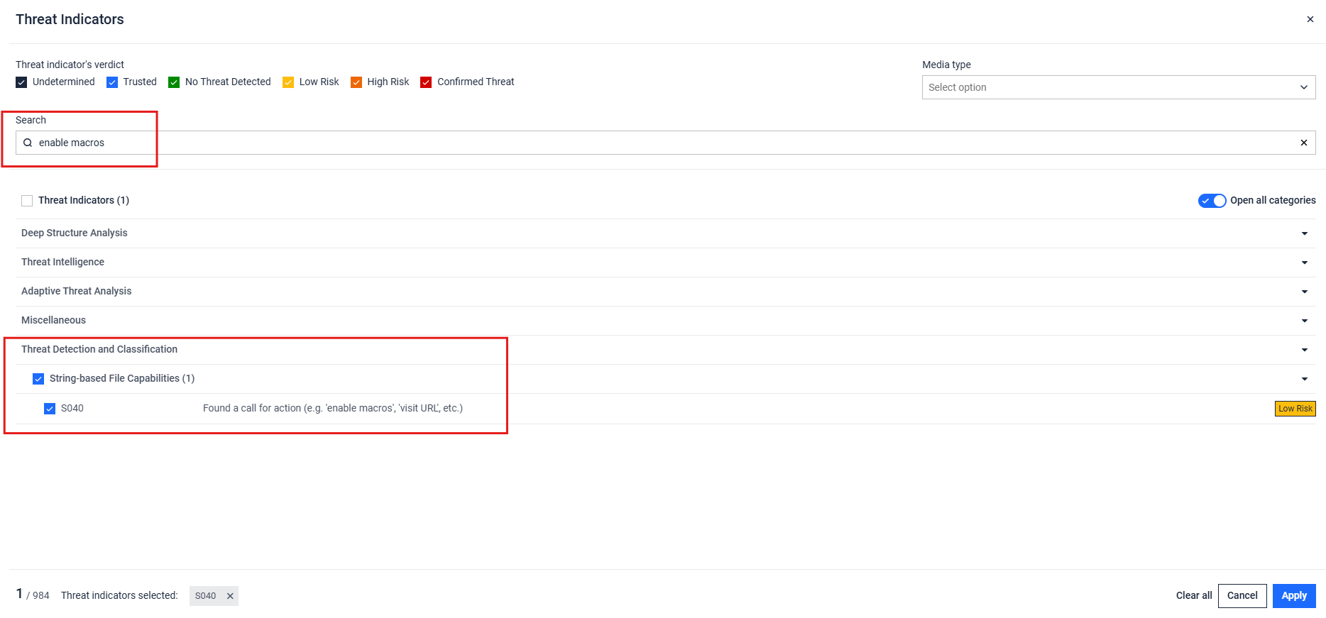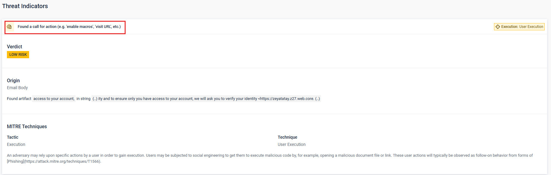 Outlined below are the steps that should be followed so that a Threat Indicator can be disabled. In this example, the aim is to disable the following Threat Indicator: "Found a call for action (e.g. 'enable macros')"