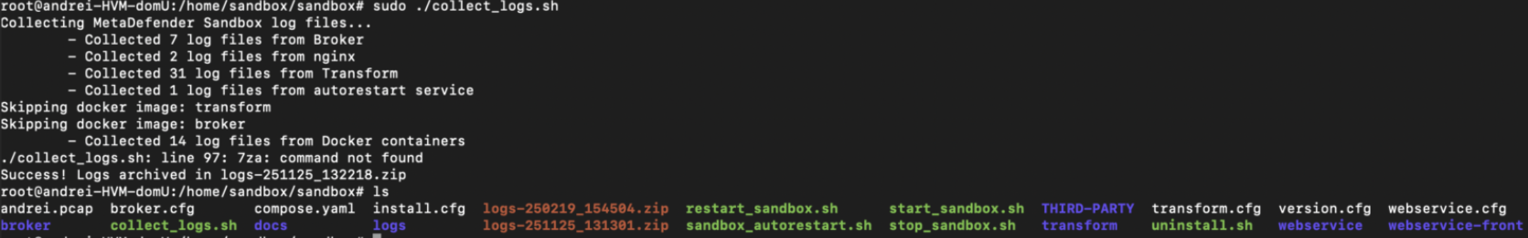 When running collect_logs.sh, the script finishes but the logs archive (logs-<timestamp>.zip) is missing. The console output shows: