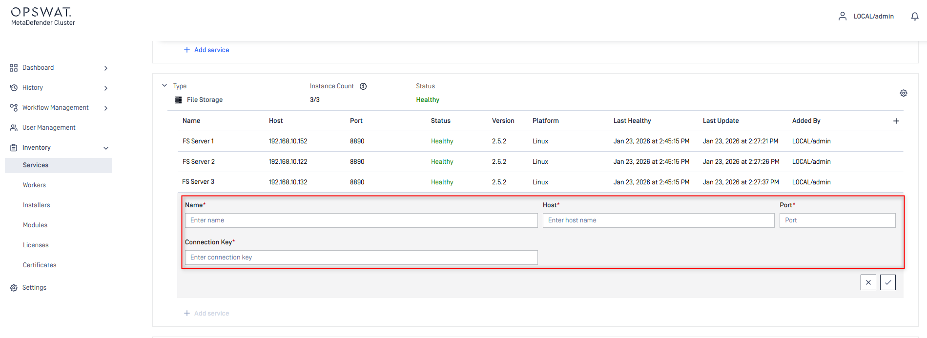 Name,Host,PortandConnection Keyfields of individual MD Cluster File Storage instances set up in Step 1. - Click the