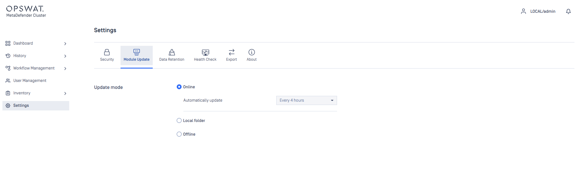 MetaDefender Cluster (MD Cluster) introduces three modes of Module Update. To switch between the modes, please sign in to MD Cluster Control Center console, navigate to Settings and select Module Update tab.