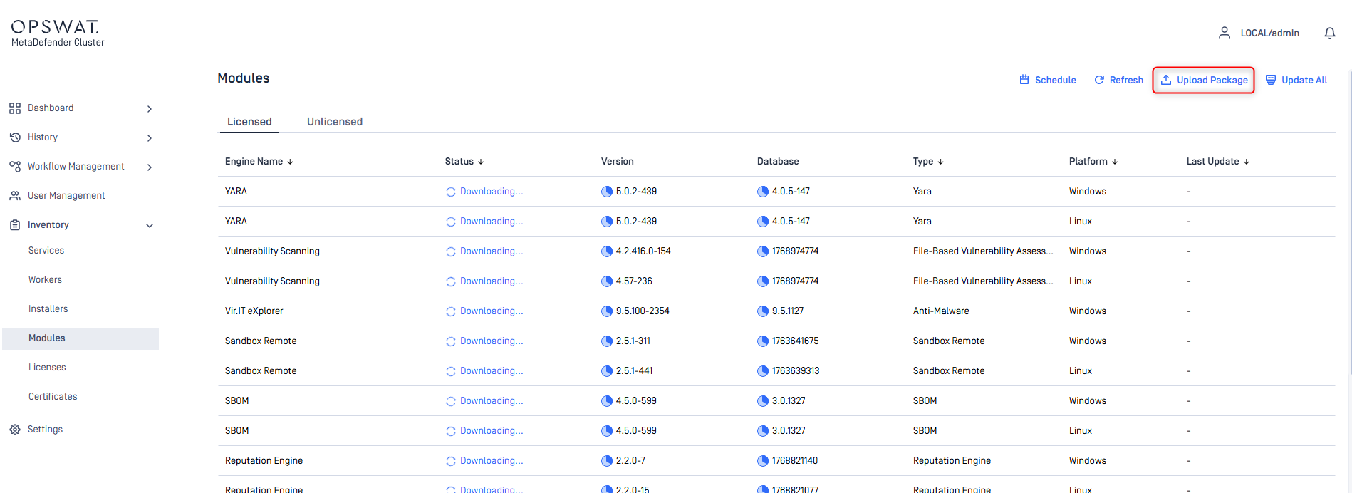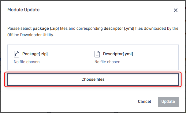 In offline update mode, administrators must download the licensed engine packages from MetaDefender Update Downloader and upload them manually to MD Cluster Control Center.