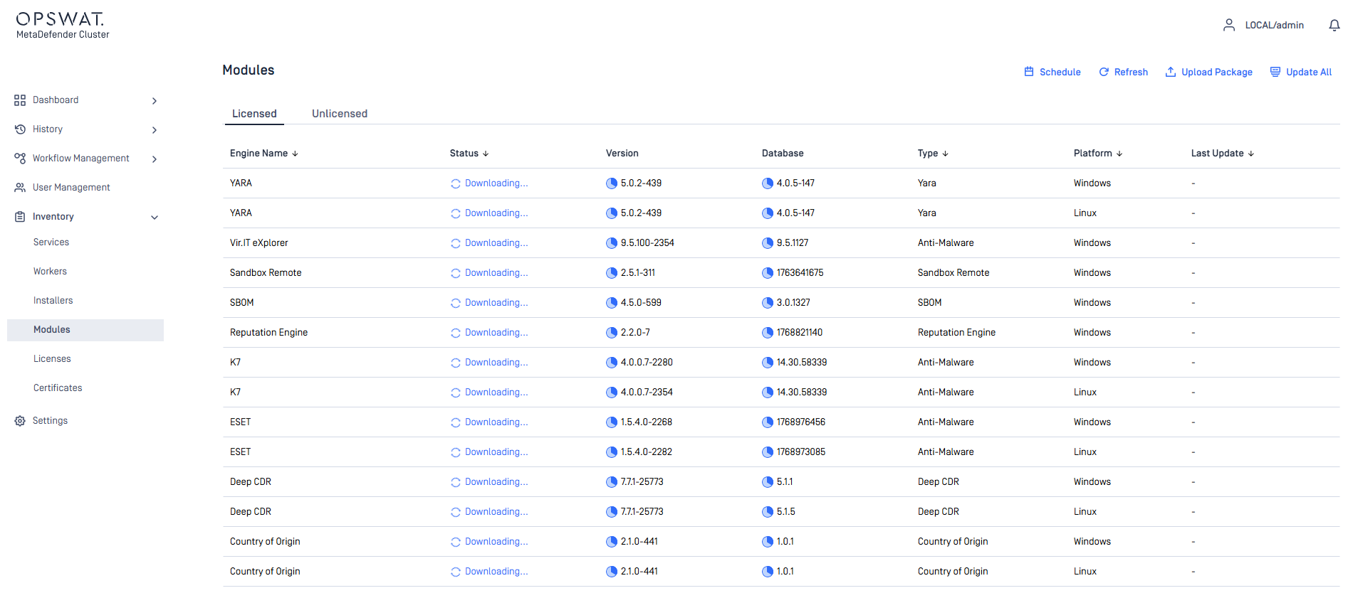 In online update mode, MD Cluster Control Center will base its checks on the activated licenses to find and download the latest engine packages from OPSWAT online update infrastructure, repeating this process every four hours.