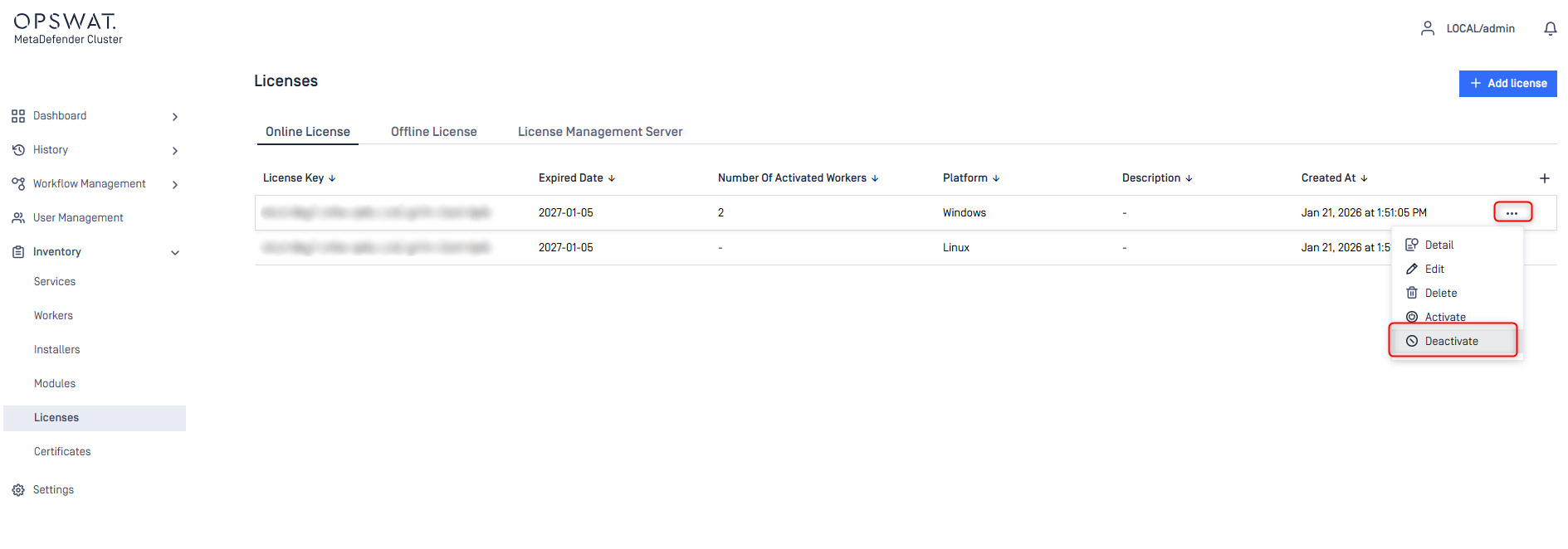 - Click Deactivate to remove the license from all MetaDefender Core instances currently activated with the license key.