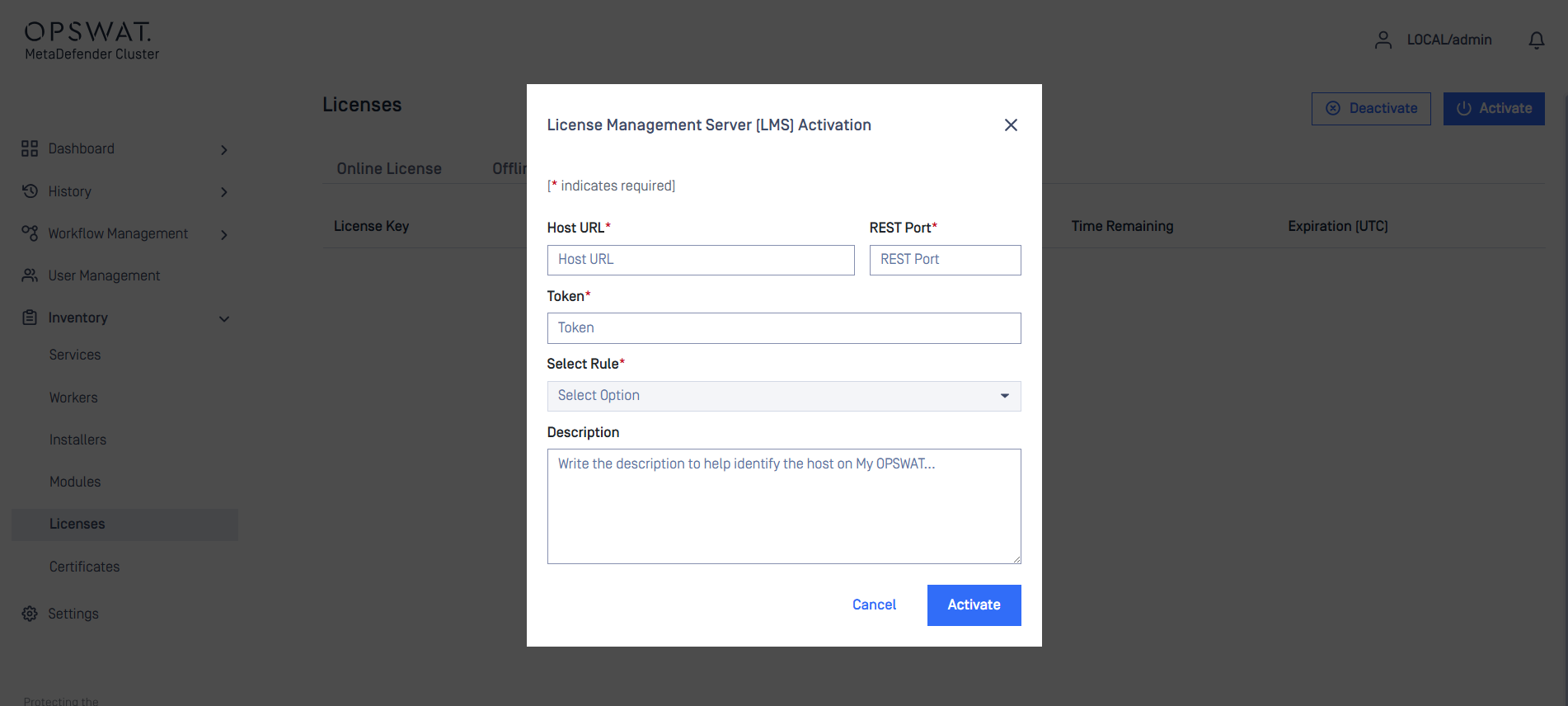 Activateand provide the necessary information in the required fields:- Host URL: The URL of the License Management Server to connect to.