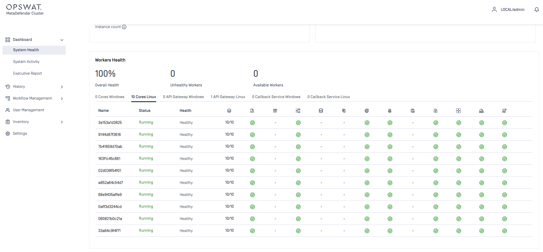 The overall health of all MD Cluster API Gateway and MetaDefender Core instances of platforms are shown here. The administrator can quickly monitor the number of AV engines installed on each MetaDefender Core instance.
