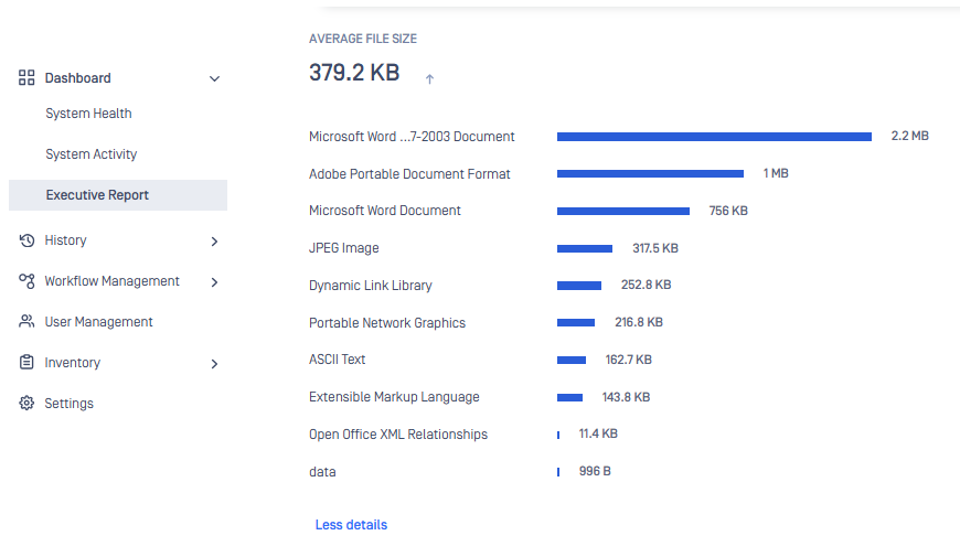 Average file size will provide detailed information on the average file size of file types that were commonly scanned.