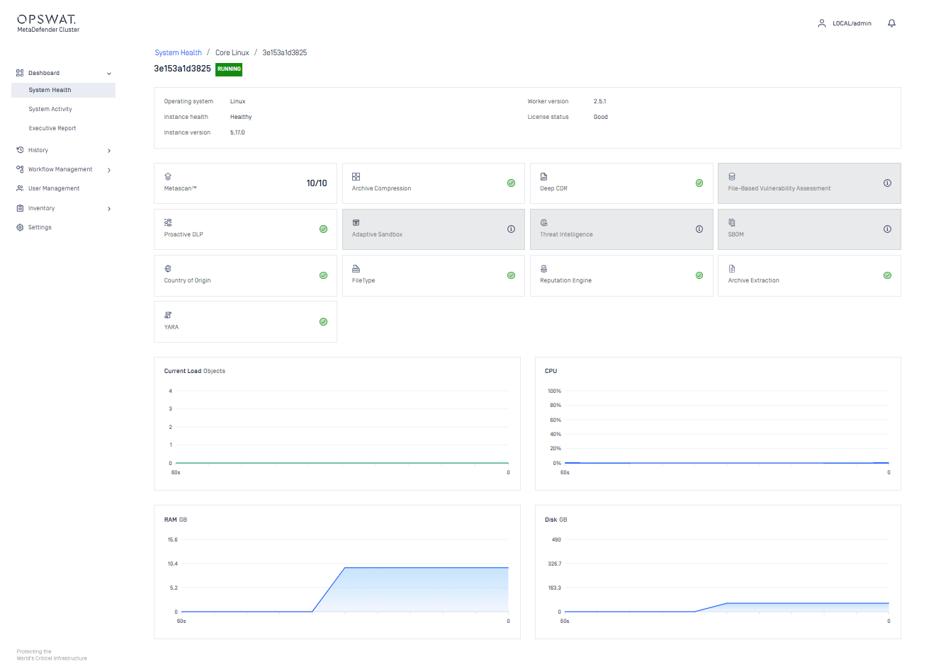 - System Activity shows the overall objects currently being processed, objects currently in-queue and average CPU usage of all MetaDefender Core instances.