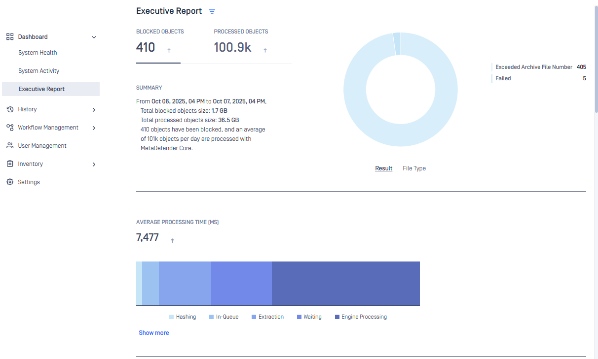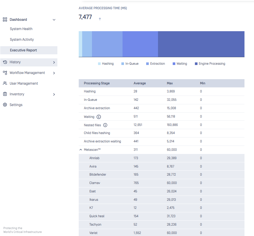 The Executive Report in MD Cluster provides statistical data on file scanning performance and metrics. This section will provide metrics and values to help you better understand your MetaDefender Cluster's performance.