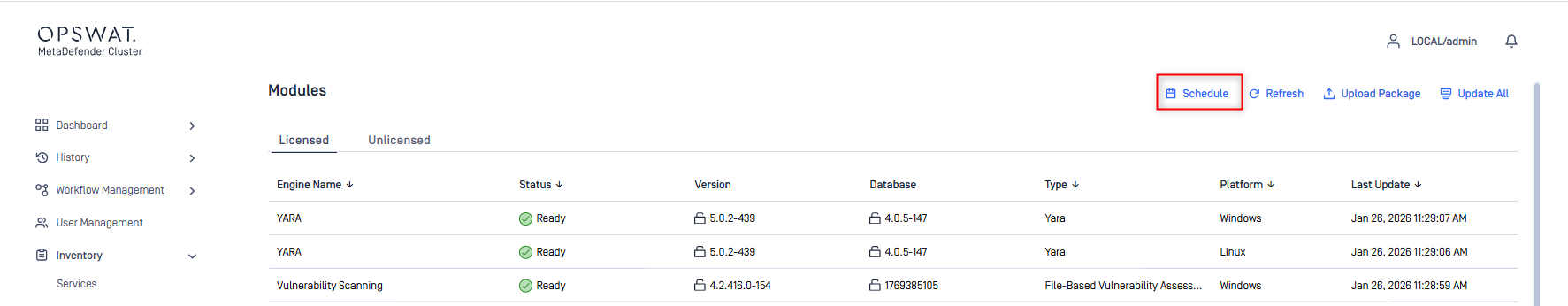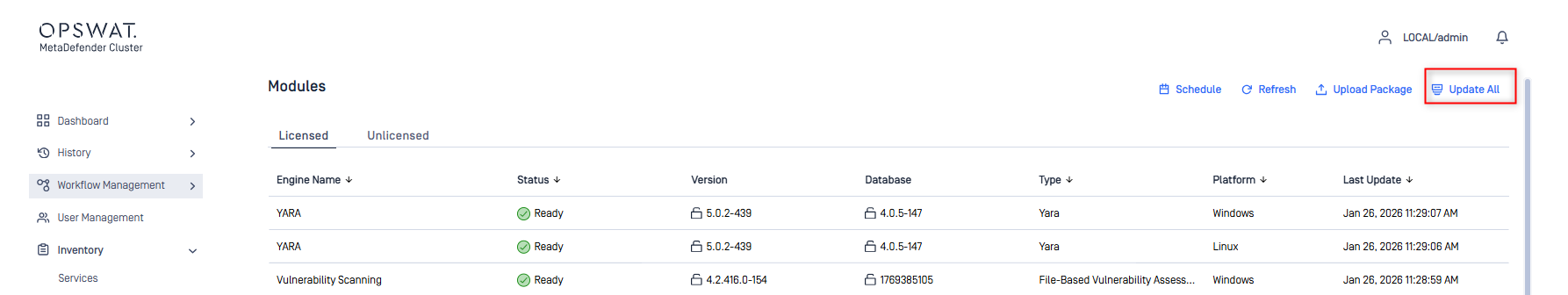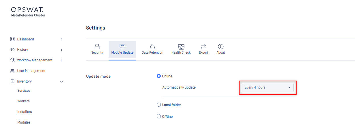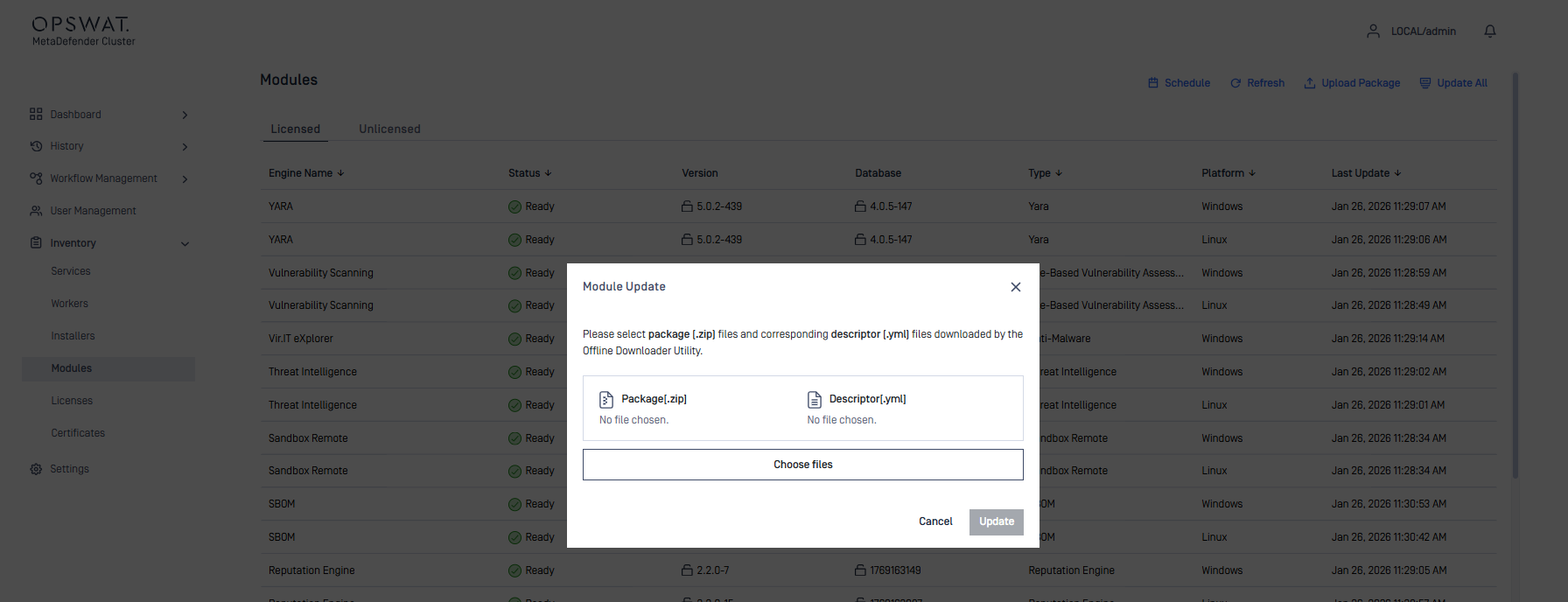 If MD Cluster Control Center does not have access to the internet. The system administrator must use MetaDefender Update Downloader to download the modules. Once downloaded, the modules can be manually uploaded to MD Cluster Control Center.