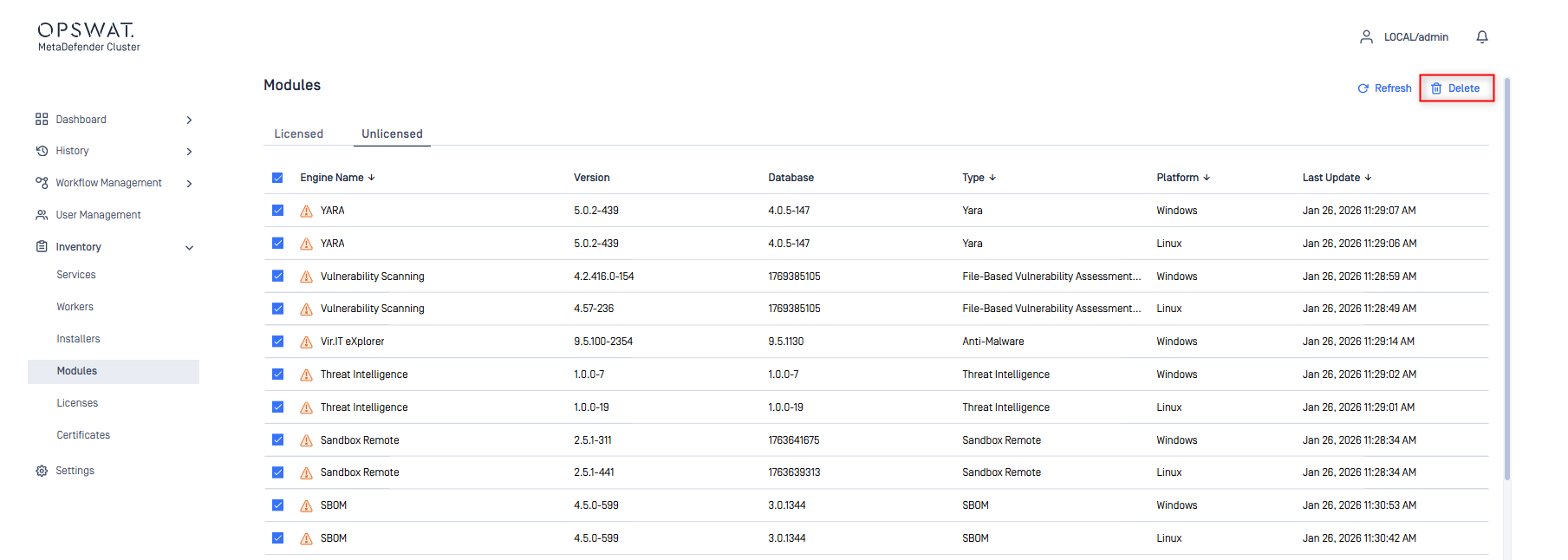 This section of Modules will show all the modules that were previously licensed. From here, since the modules are no longer licensed they can be removed by selecting all the modules and clicking Delete.