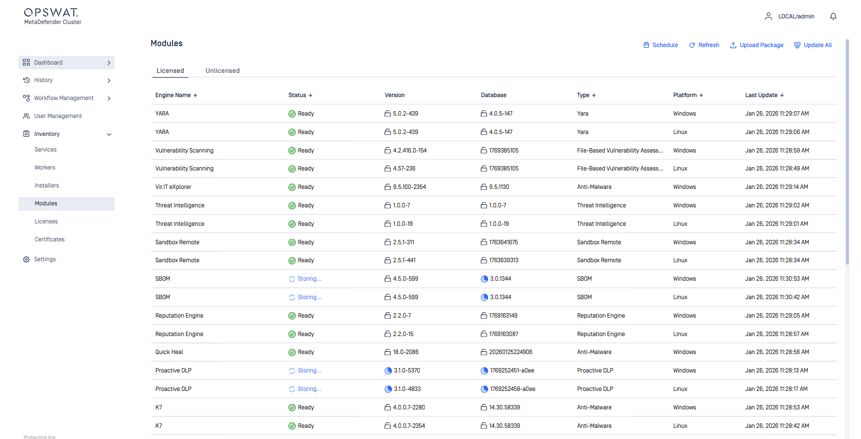 This section of the Modules will show all the modules that are available and will be used when MetaDefender Core is deployed. The modules shown in this section are based on the MetaDefender Core license. Modules are automatically downloaded if the MD Cluster Control Center has access to the internet.