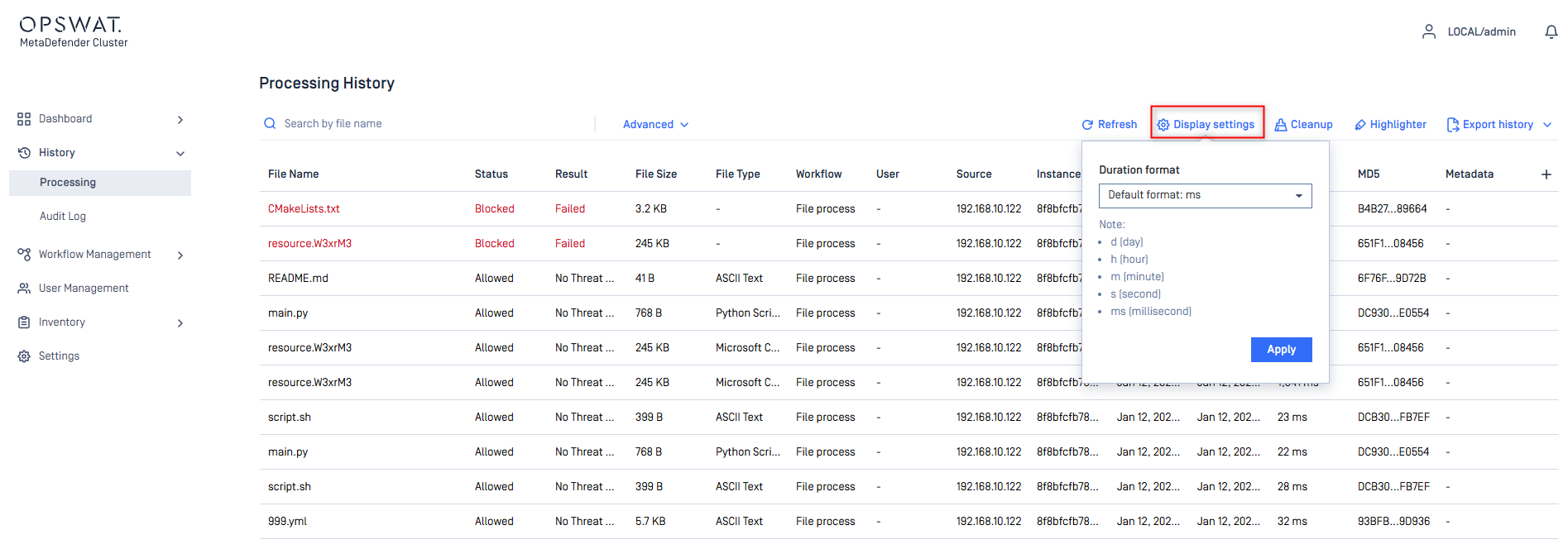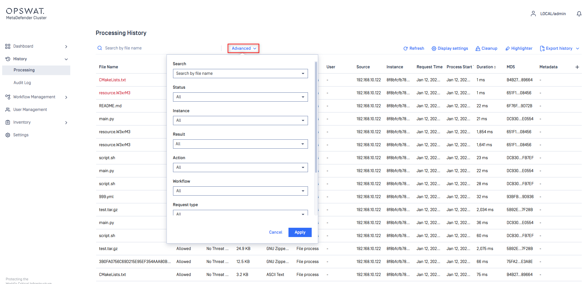 The Processing History section shows information on all scans made on MetaDefender Cluster (MD Cluster). Search and Filter are also supported against each scan result attribute. The user can search based on the following: