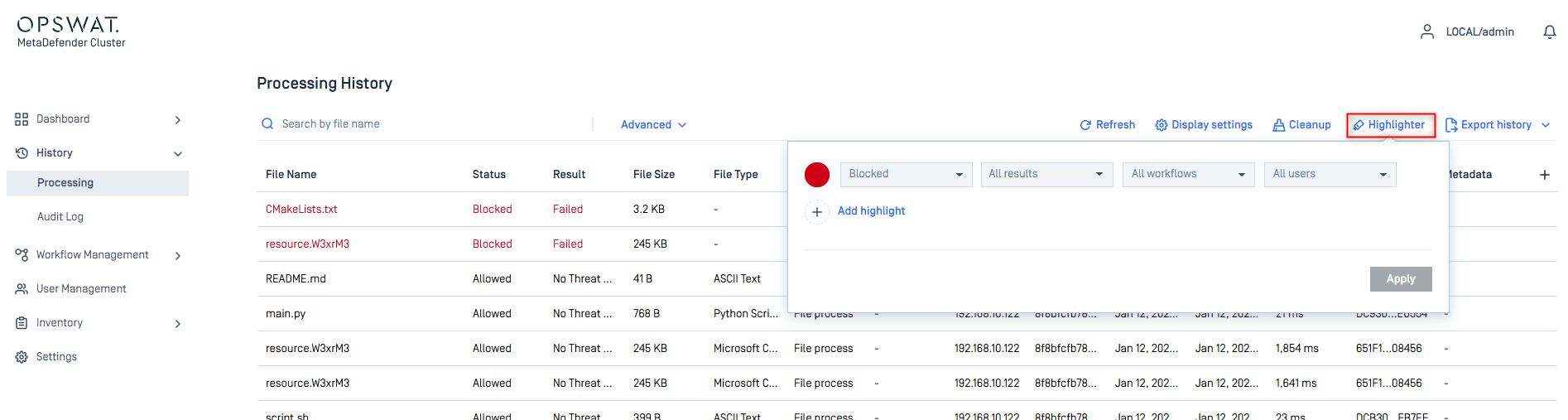 Highlight allows the user to highlight a specific scan result based on color. This way, it will be easier to see visually for example, what is Blocked, Sanitized, Failed, etc...