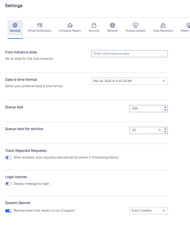 This setting allows you to enable or disable notifications when the MetaDefender Core version reaches end of support. It also provides the option to configure the reminder timing for such notifications.