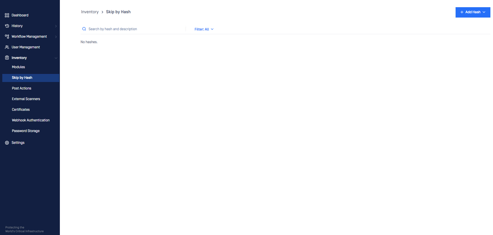Screenshot of a cleared Skip by Hash list which shows that the API call has successfully removed all Skip by Hash entries.