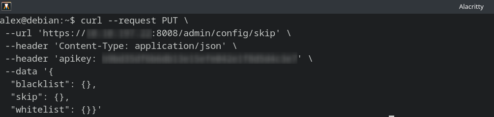xxxxxxxxxxcurl --request PUT ^ --url "http://YOUR CORE IP HERE:8008/admin/config/skip" ^ --header "Content-Type: application/json" ^ --header "apikey: YOUR API KEY HERE" ^ --data "{ \"blacklist\": {}, \"skip\": {}, \"whitelist\": {} }"For Linux/macOS (Shell / Bash):
