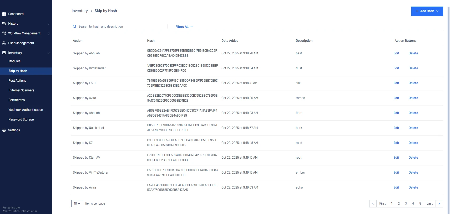 When multiple skip-by-hash entries are present, or the volume is too large to manage manually, this method provides the recommended approach of using an API call to efficiently clear the list. Screenshot of a populated Skip by Hash list.
