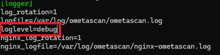 /etc/ometascan/ometascan.confwith your preferred text editor. - In the [logger] section, change the value of