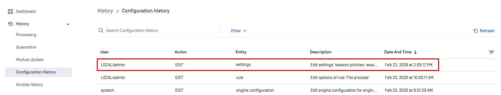 - Such changes can be tracked on the UI > History > Configuration history: