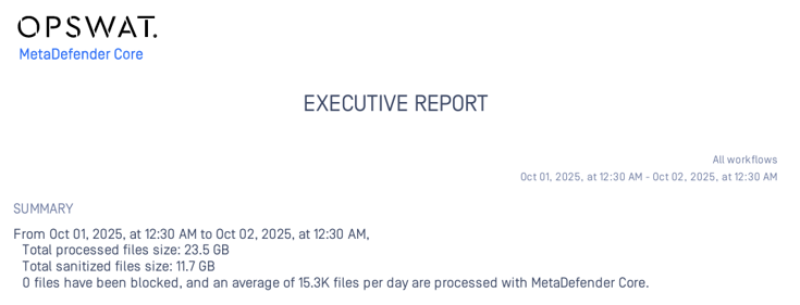 Users may notice a time difference between the selected time range in the MetaDefender Core UI and the time displayed in the exported Executive Report (PDF). This behavior is caused by a difference between the local time zone of the user’s browser and the system time zone of the MetaDefender Core server.