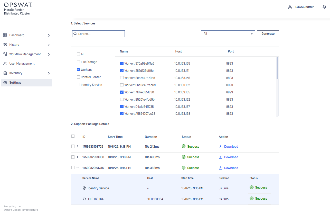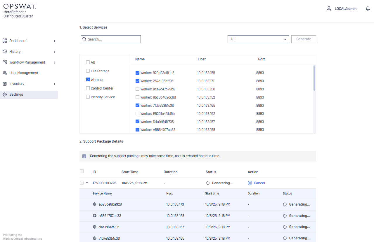 This section will allow the system administrator to export MetaDefender Distributed Cluster (MDDC) support packages. The support package contains all relevant information to help us diagnose the issue of MetaDefender Distributed Cluster.