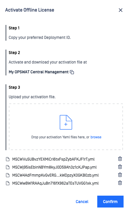 • Sign in to My OPSWAT and then head to License Management-> Activate License and for each DeploymentID, click Activate and download the license files.