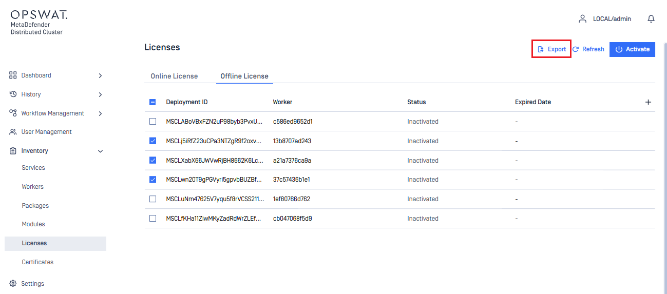 With no internet connection on MDDC Control Center, MetaDefender Core instances can be activated indirectly from a different machine that has internet connection. The system administrator must obtain all DeploymentID's of the MetaDefender Cores and then activate each DeploymentID separately to obtain their license file from My OPSWAT.