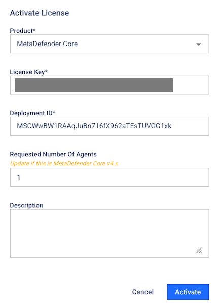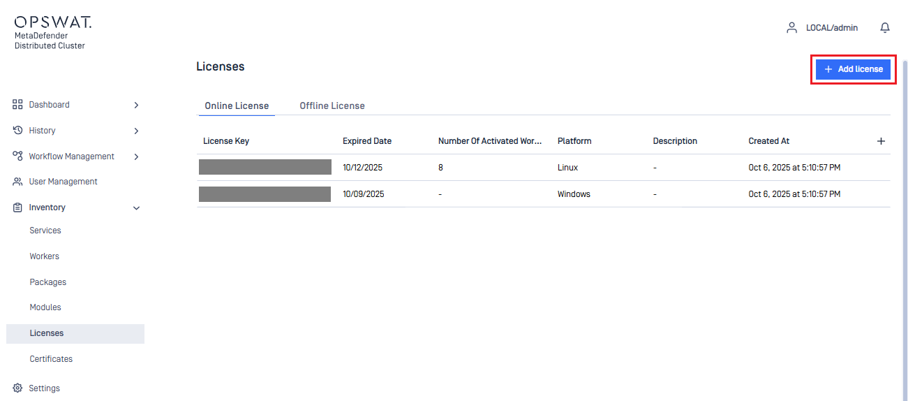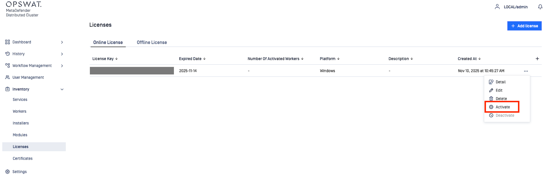 Once the system administrator obtains all the license files. Simply activate the MetaDefender Core instances on MDDC Control Center.