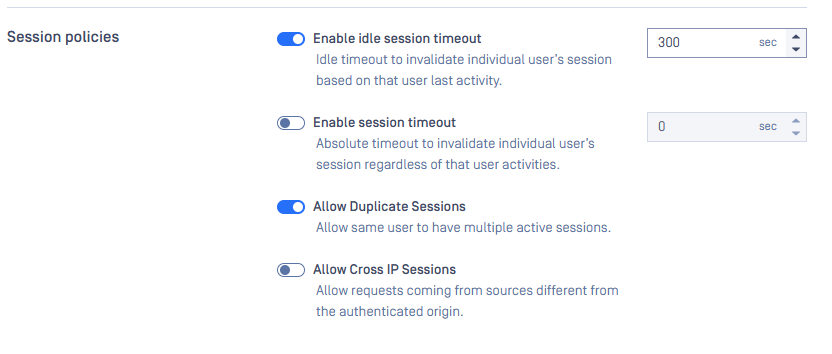 - Idle session timeout: Idle timeout to invalidate individual user’s session based on that user last activity.