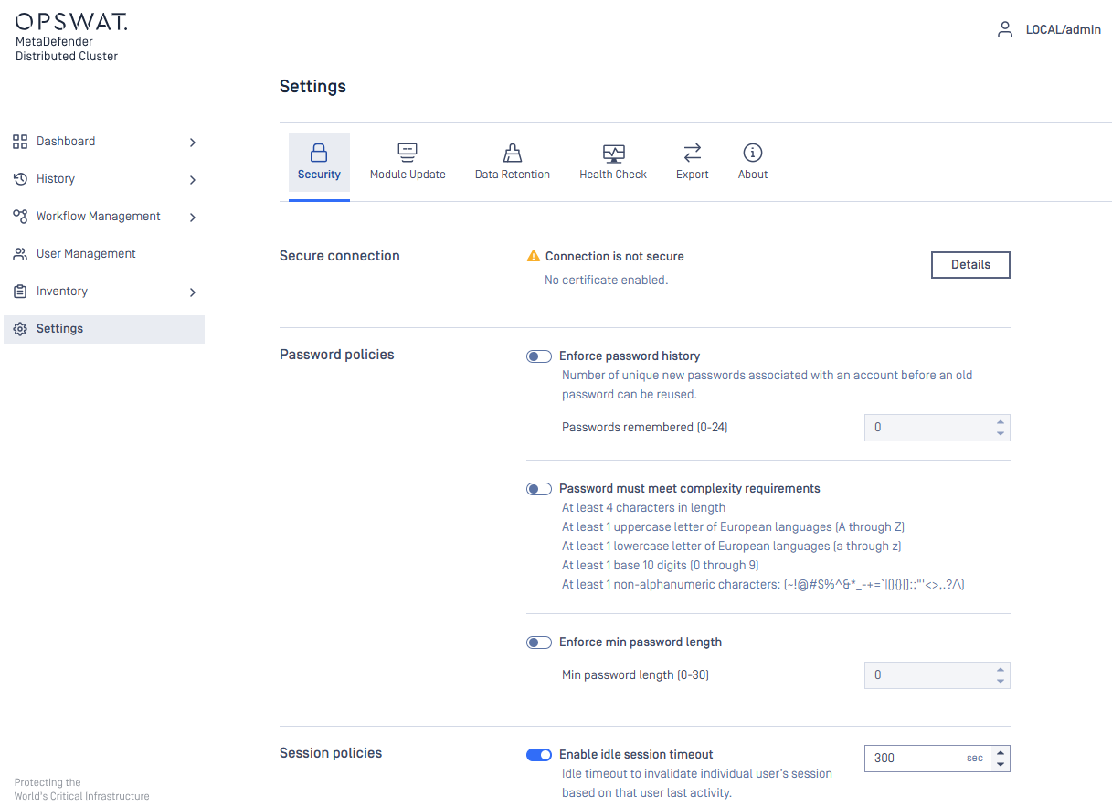 This section will allow the system administrator to enable secure connections to MDDC Control Center if required. In addition, Password and Session policies are set in this section.