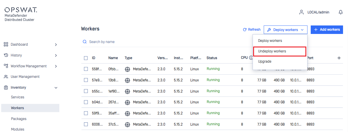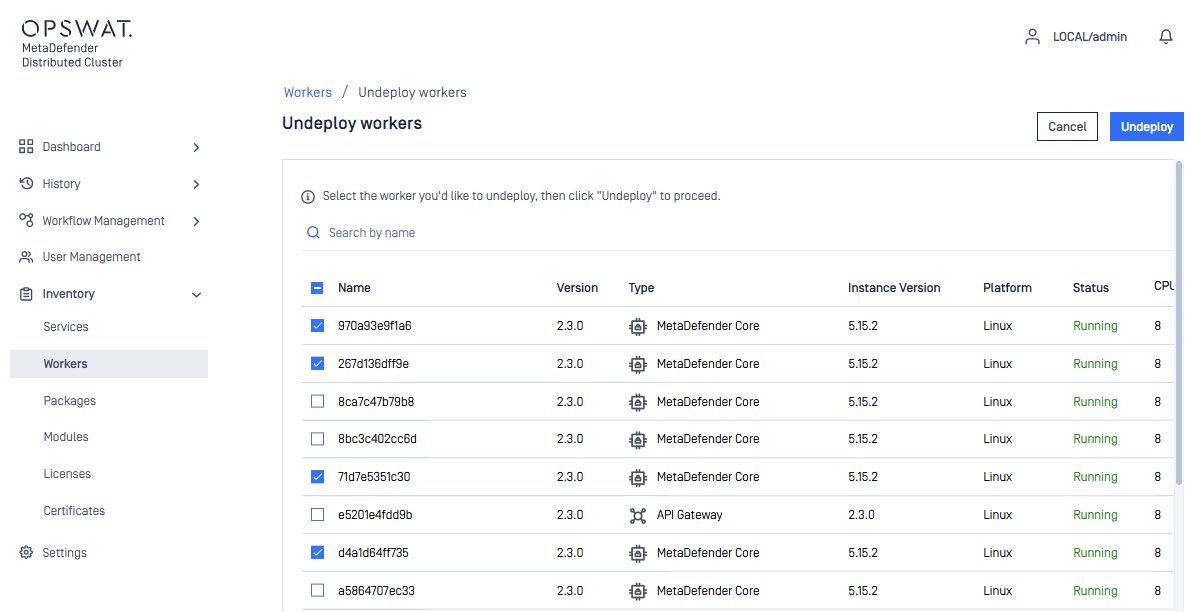 To release MDDC API Gateway, MDDC Callback Service, or MetaDefender Core on MDDC Workers, the system administrator can select Undeploy workers in the top right corner.