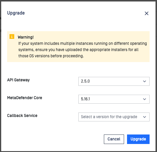 The system administrator can then choose the new version of MDDC API Gateway, MDDC Callback Service and MetaDefender Core to perform the upgrade.